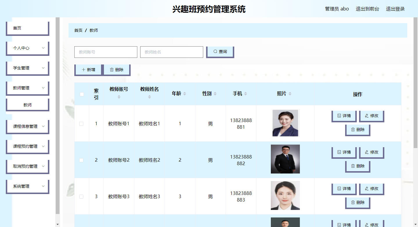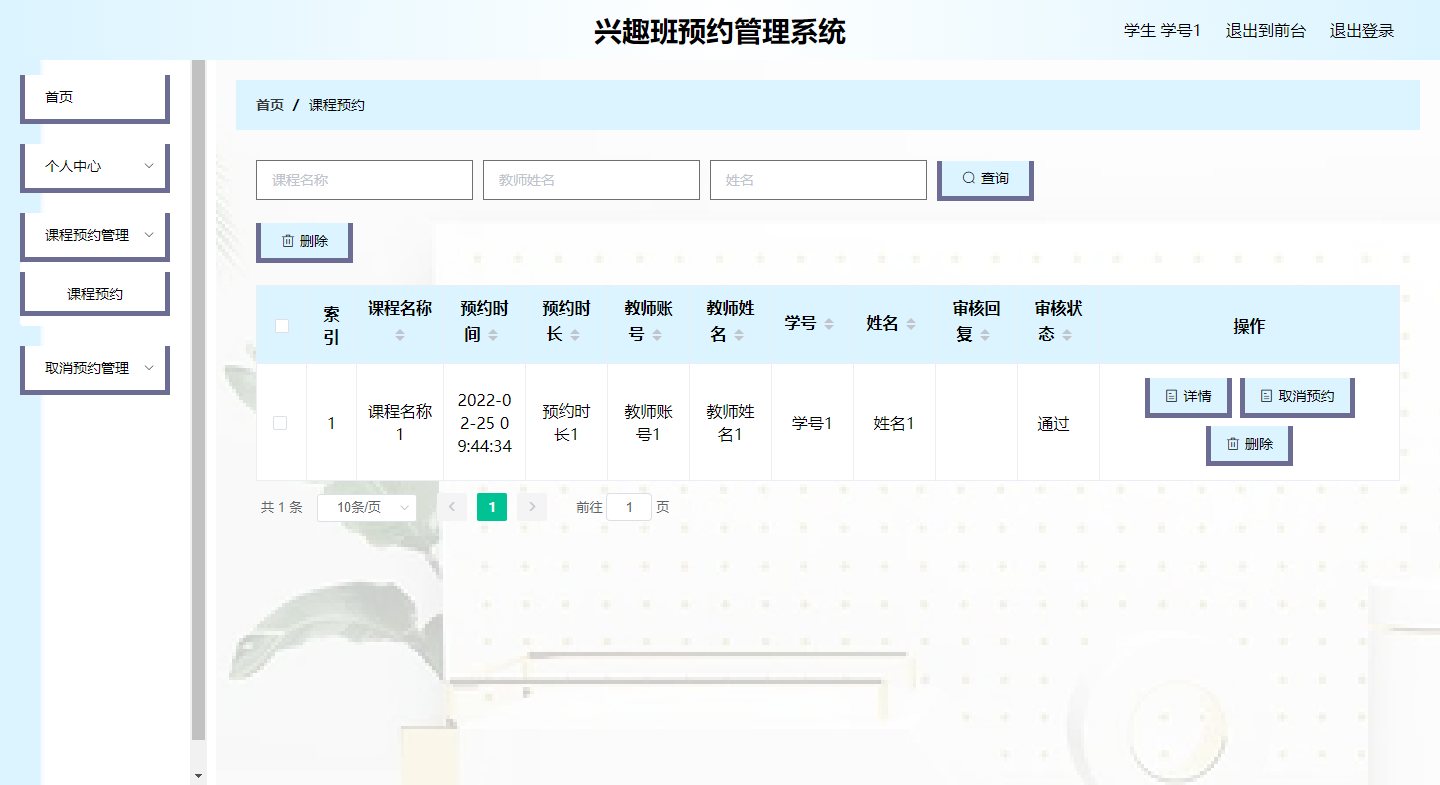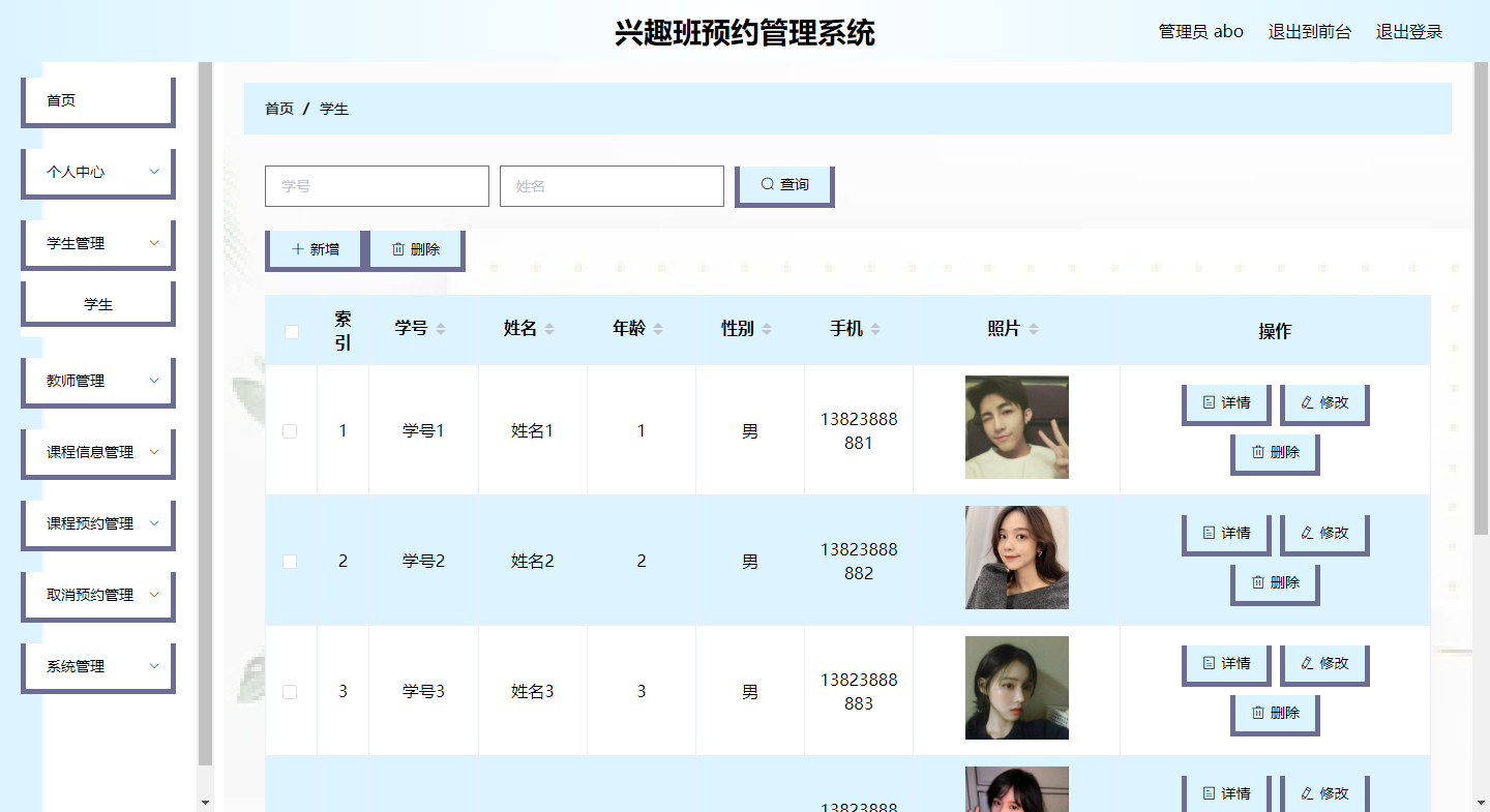 The fast-paced development of the modern economy and the continuous improvement and upgrading of information technology have upgraded the management of traditional data information to a management method of software storage, induction, and centralized processing of data information. This hobby class reservation management system was born in such a big environment. It can help managers to process huge data information in a short time. Using this software tool can help managers improve transaction processing efficiency and achieve multiplier effect with half the effort. This interest class reservation management system uses the current mature and perfect Python technology and the MySQL database, one of the most popular RDBMS application software, for program development. The interest class reservation management system has three roles: administrator, teacher, and student. The administrator functions include personal center, teacher management, student management, course information management, course appointment management, cancellation appointment management, and system management. Both students and teachers can register and log in. Teachers can view their own course information, and conduct review and query operations on students’ reservation and cancellation of their own course information. Students can search and view course information, and can make reservations and cancel reservations for course information. The development of the hobby class reservation management system is designed according to the needs of operators. The interface is simple and beautiful, and the layout of functional modules is consistent with the same type of website. When the program realizes the basic required functions, it also provides some practical information for the security problems faced by data and information. solution. It can be said that this program not only helps managers deal with work affairs efficiently, but also realizes the integration, standardization and automation of data information.